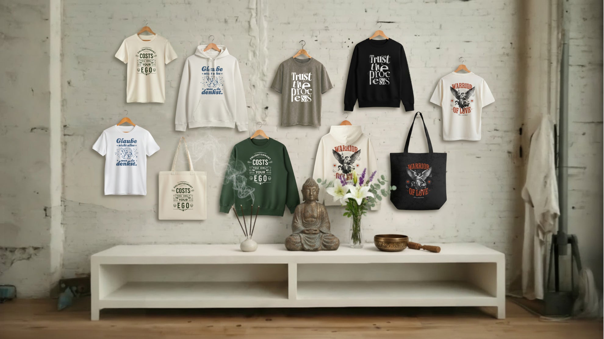 WENN ALLES DUNKEL IST – SEI DAS LICHT. WIR KREIEREN KEINE MODE. WIR ERSCHAFFEN AFFIRMATIONEN. UNSERE PRODUKTE SIND UMARMUNGEN AUS BAUMWOLLE, GETARNT ALS KLEIDUNG.